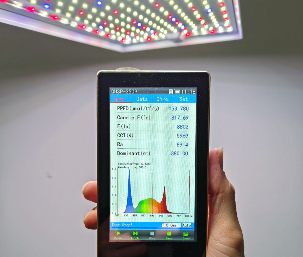 My spectrometer displaying measurements for PPFD, FC, lux, color temperature (CCT), color rendering index (Ra), dominant wavelength (nm), and the spectral power distribution (SPD) – all in the palm of my hand!