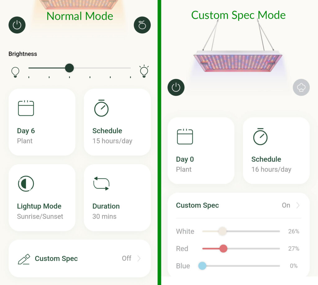 (Left) The main screen in the LetPot app is clean and functional, giving you access to all the settings in one place. (Right) In Custom Spec mode, the sliders control the strength of each type of LED.