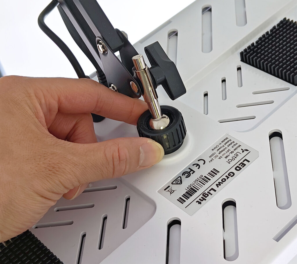 The grow light panel is connected by a ball joint that can be set in place using the tightening collar.