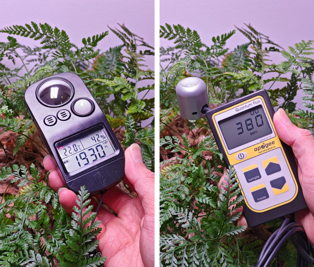 Measuring the strength of the light at the leaf (in FC, left or PPFD, right) is essential to know whether your grow light is positioned correctly. You can’t rely on specs alone.