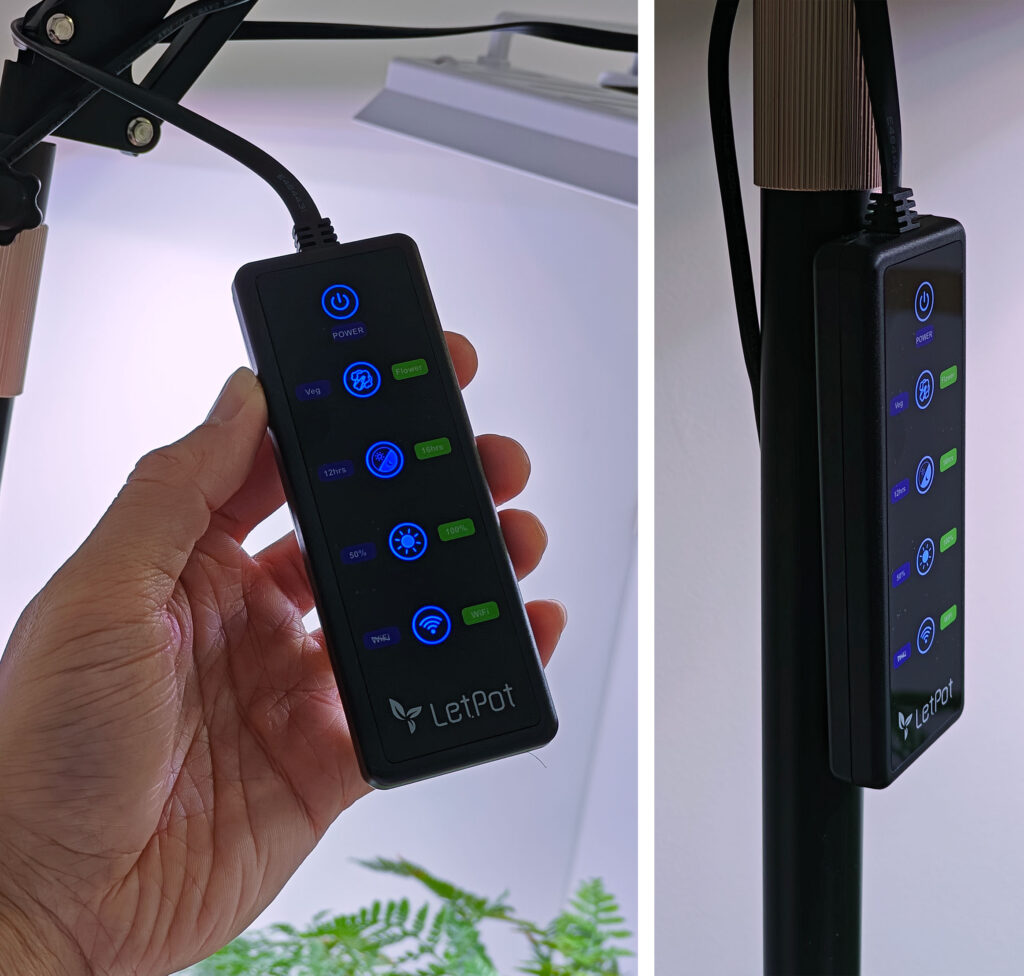 The wired remote controls a few functions (the app controls far more – we’ll discuss later) but the most convenient thing was how it can connect magnetically to the stand – it’s not just dangling from the grow light!