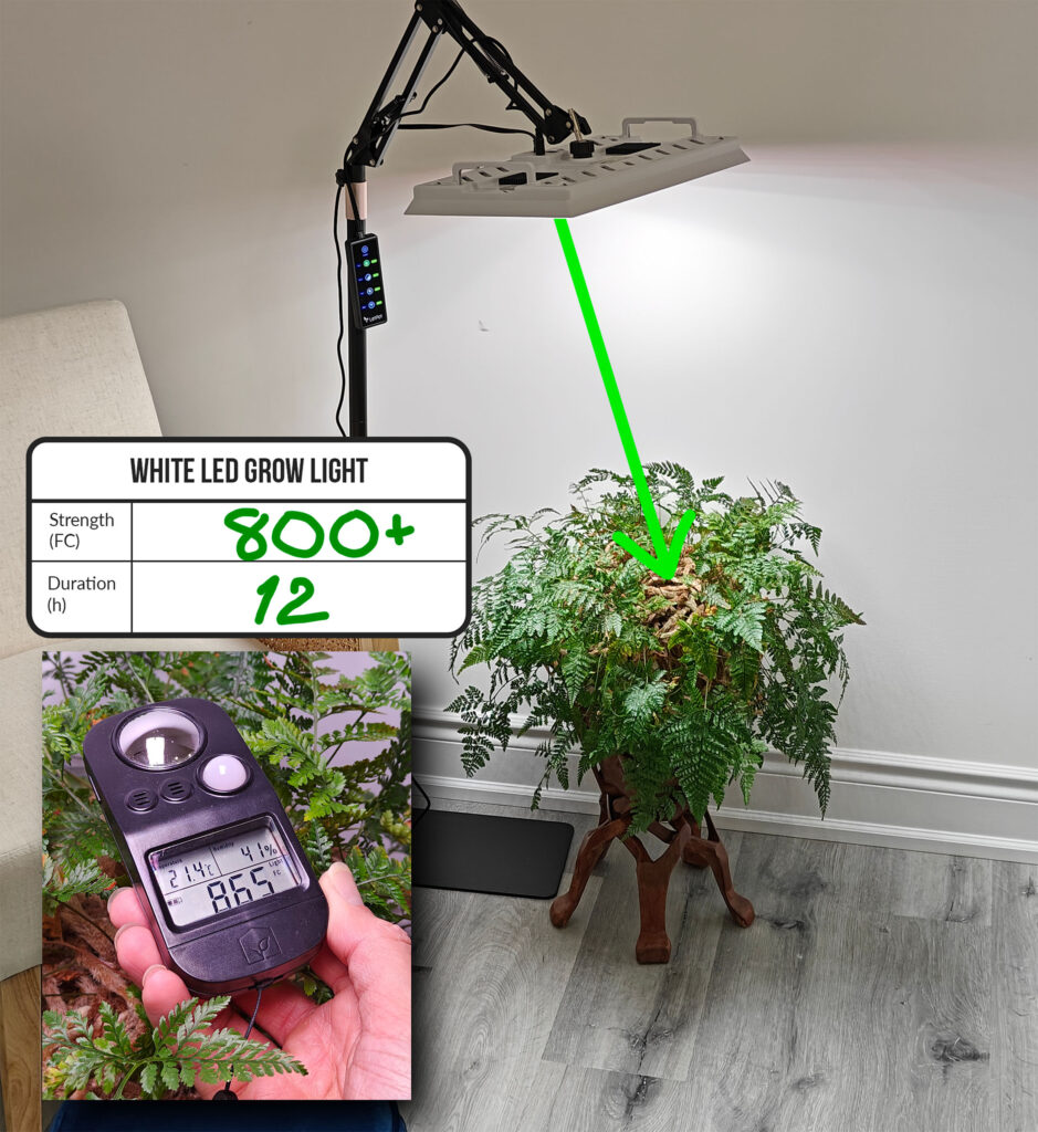 How much light does your specific plant actually need? For this, you’ll want to check out my article ‘Grow Light Strength Recommendations by Plant’ – where you’ll find a table of many common houseplants and recommended PPFD/FC values. In general, for starting seedlings or sustaining high-light plants like succulents/cacti, the LetPot grow light will work well within 12″ to 24″. Most of your tropical foliage houseplants will happily grow farther away, where the strength still hits the 400-800 FC range (80-160 µmol).